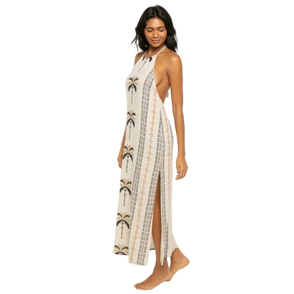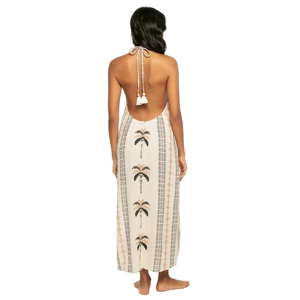 Maxi dress features a high neckline and adjustable halter strap adorned with large tassel details.