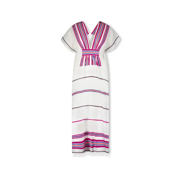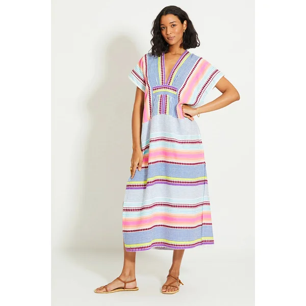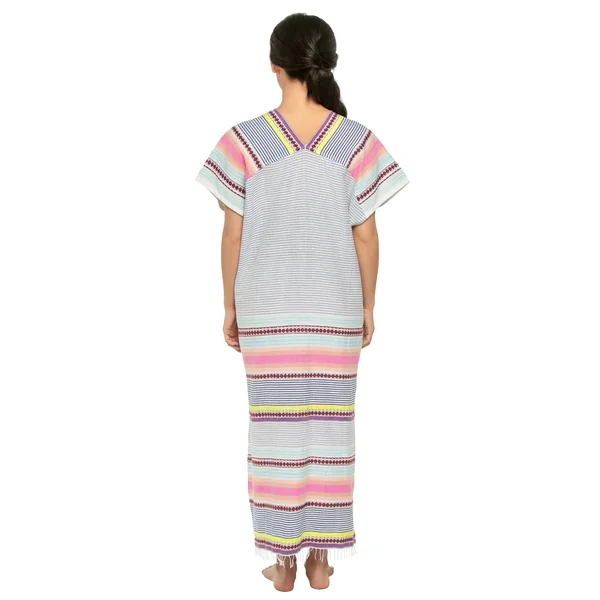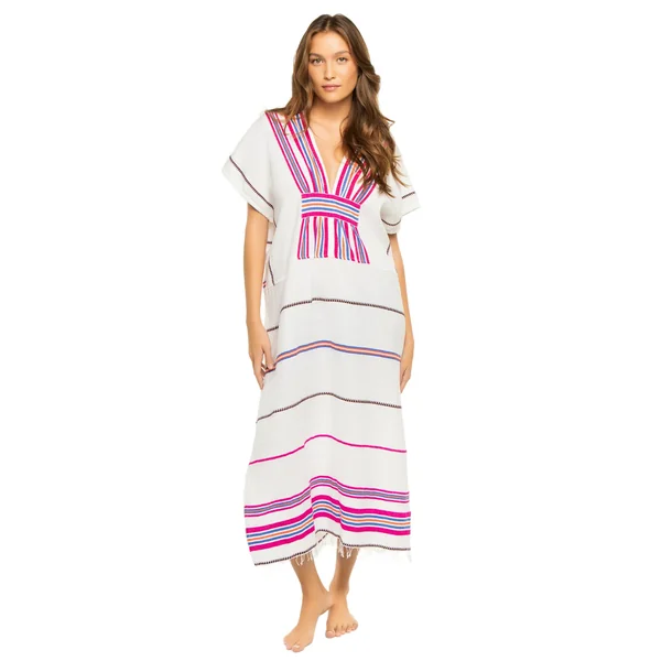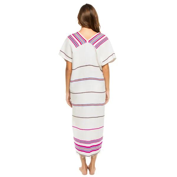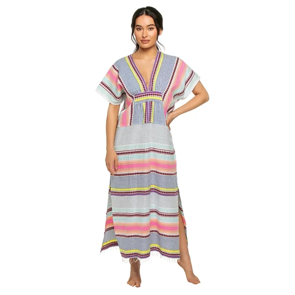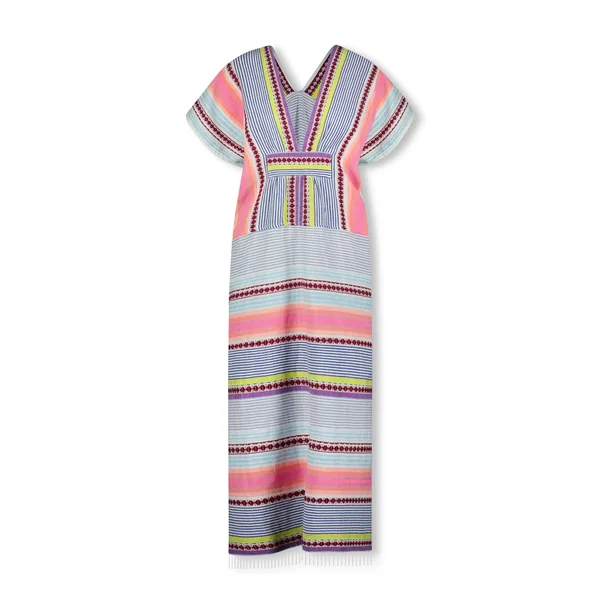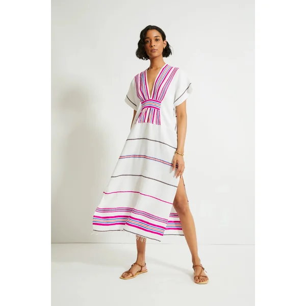 Gasira handwoven caftan features decorative stripes, textured weave, plunge neckline, kimono cap sleeves and gathered empire waist.