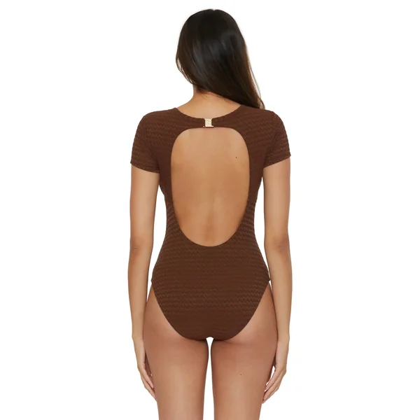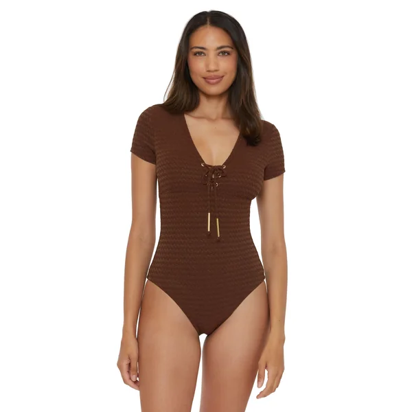 One piece swimsuit features textured shimmer fabric and deep v-neckline with lace-up ties adorned with gold tone tube beads. Offers removable soft cups, short cap sleeves, hook back closure, and moderate bottom coverage.
