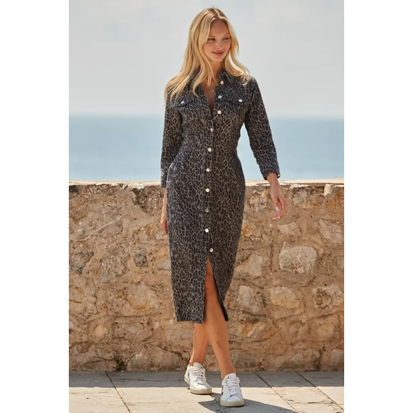 Be the first to review “Grey Leopard Print Denim Shirt Dress With Pockets”