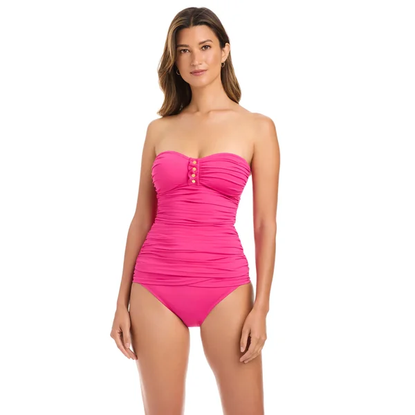 Tankini top features a bandeau style neckline with ruffle and stud details down the center. Offers a shirred bodice for a slimming effect, molded cups, and an adjustable, removable halter strap.