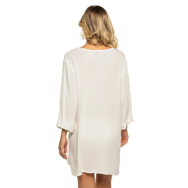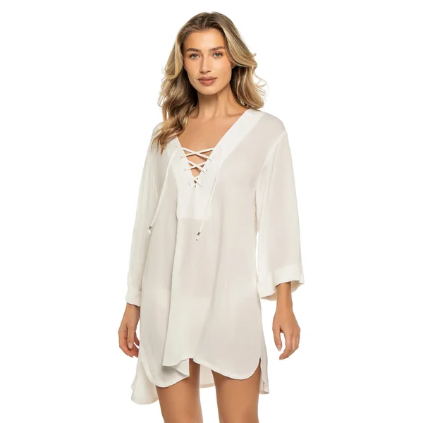 Tunic features a plunge neckline with lace-up detail and long sleeves.