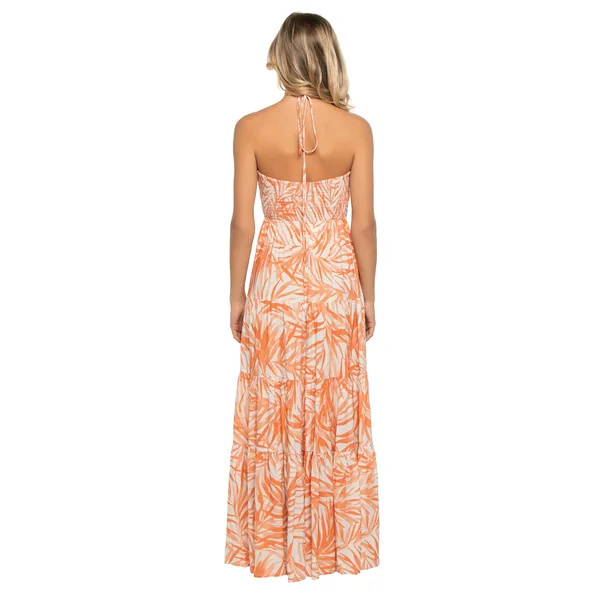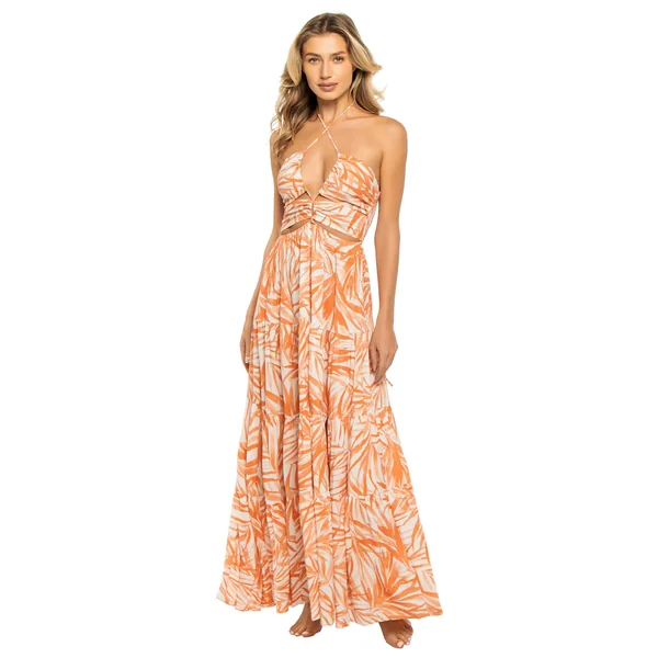 Maxi dress features plunge neckline, cut-out details and tiered ruffle skirt. Offers a smocked back and adjustable halter ties.