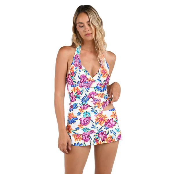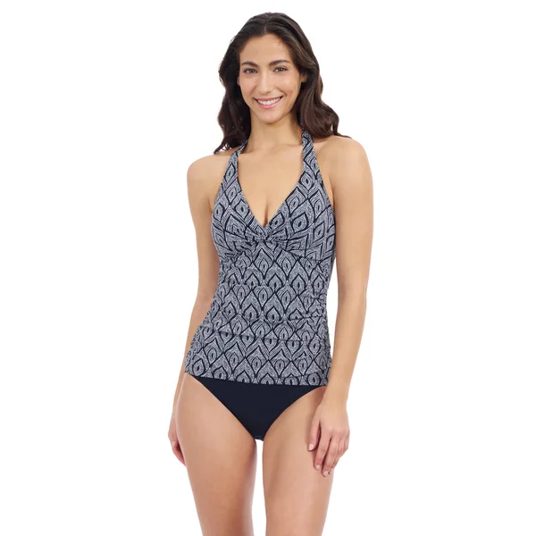 Tankini top features underwire support, soft cups and adjustable neck tie.