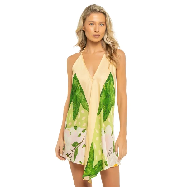 Mini dress is crafted in soft, sustainable and biodegradable Bemberg satin and features a v-neckline, low open back and adjustable thin halter ties adorned with crystal tassels.