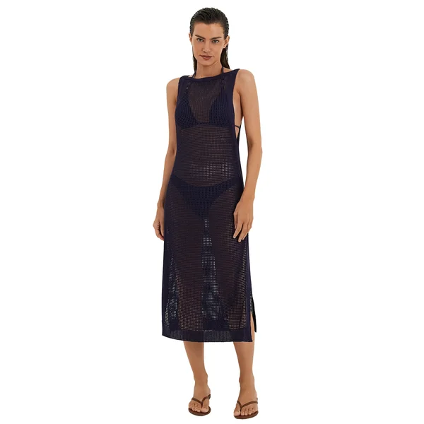 Knit midi dress features a boat neckline, deep armholes, side slits and offers a relaxed fit.