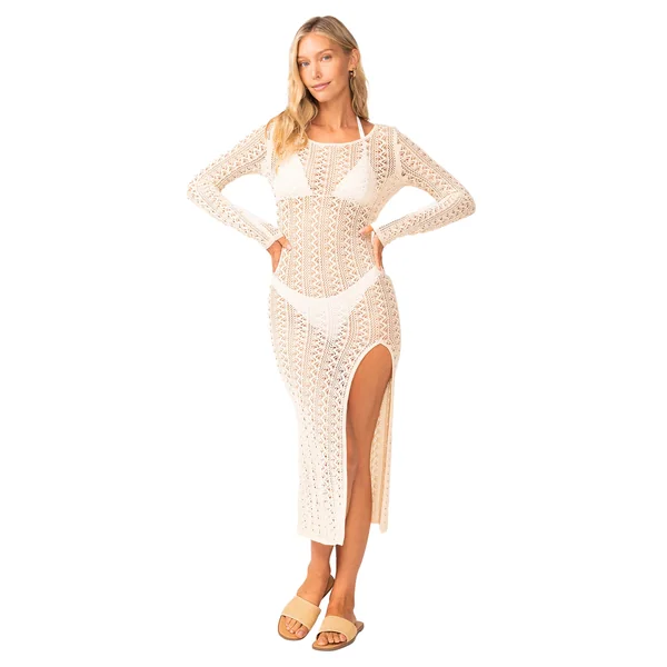 Crochet lace midi dress features a bodycon silhouette, open back and high slit.
