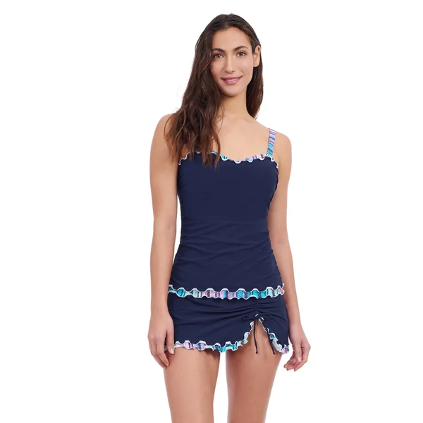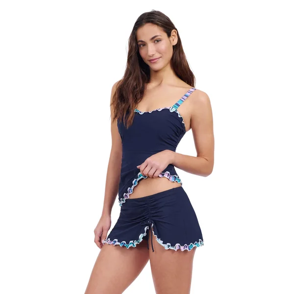 Tankini top features ruffled trim, offers supportive underwire, foam cups, and adjustable straps.