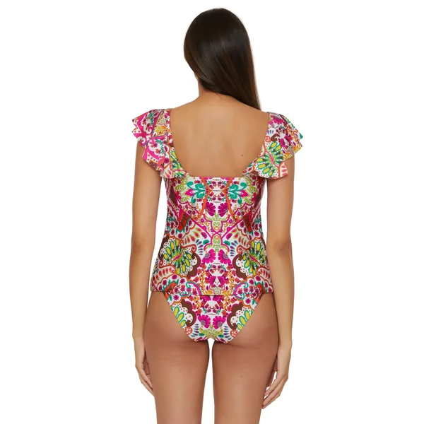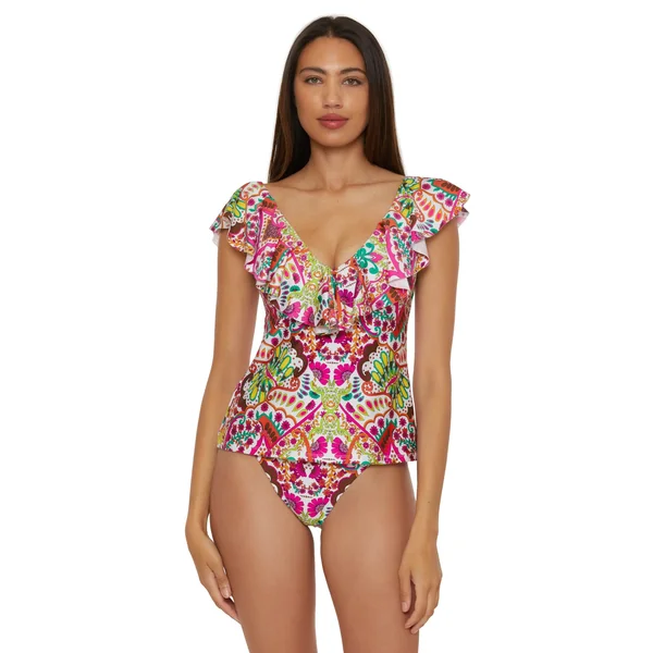 Tankini top features bright floral print and v-neckline trimmed with flouncy ruffles. Offers shelf bra with removable soft cups.