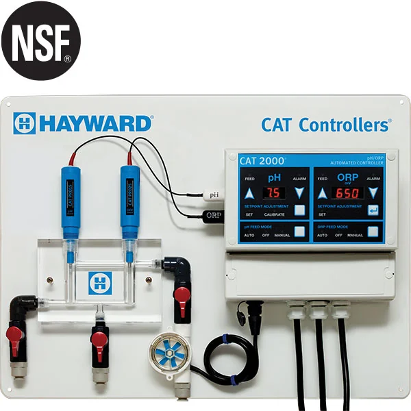 Hayward’s CAT 2000 swimming pool chemical controller offers powerful, affordable water chemistry management. It monitors pH and sanitizer activity to maintain safe and healthy pool water at all times and automatically initiates required chemical feeding. The CAT 2000 chemical controller is compatible with chlorine, bromine and salt pool sanitizing systems. The CAT 2000 chemical controller professional package pairs CAT professional series pH and ORP sensors with a digital, microprocessor-based control interface. 5 year warranty on electronics, 26 months warranty on sensors.
