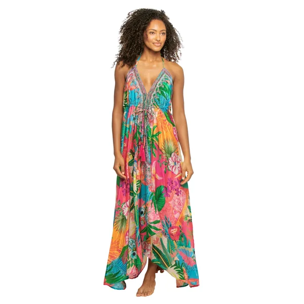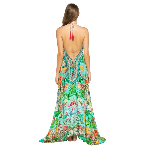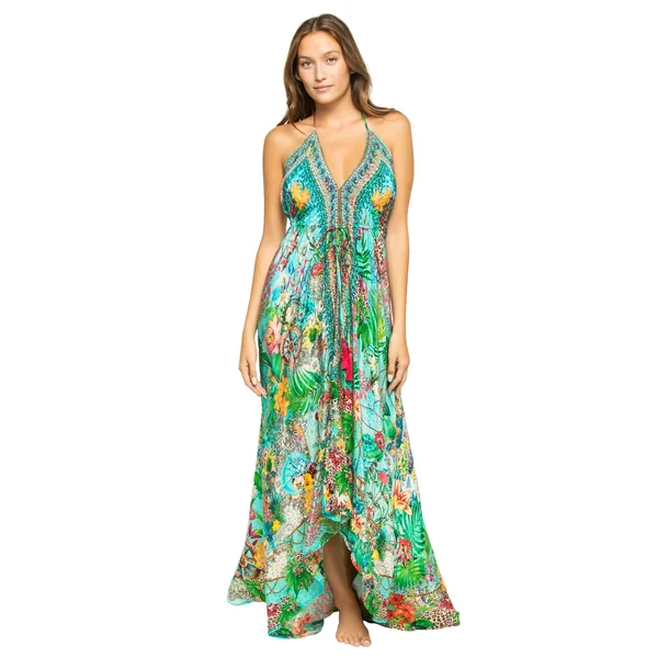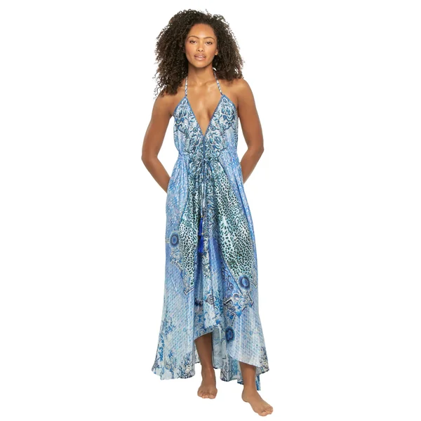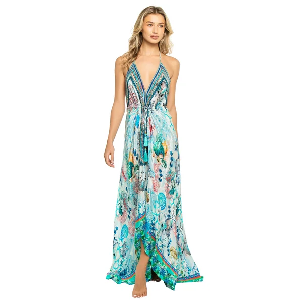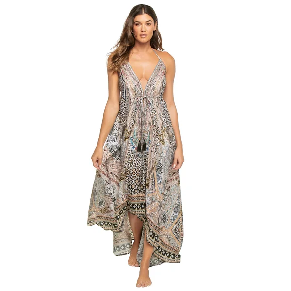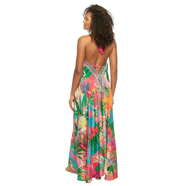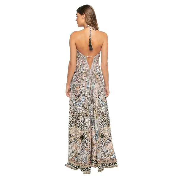 Maxi dress showcases a multi-patterned color scheme with an ultra-flowy silhouette and asymmetric hem. It features a deep v-neckline with hook and eye closure to adjust your coverage and adjustable halter straps adorned with tassel details.