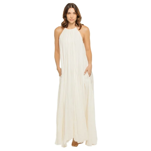 Maxi dress features an ultra flowy silhouette, high neckline, pockets and ties at the back.