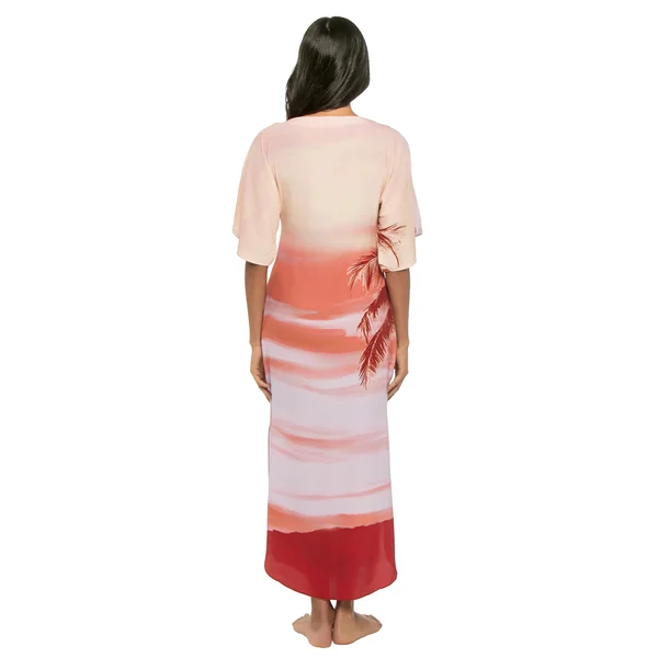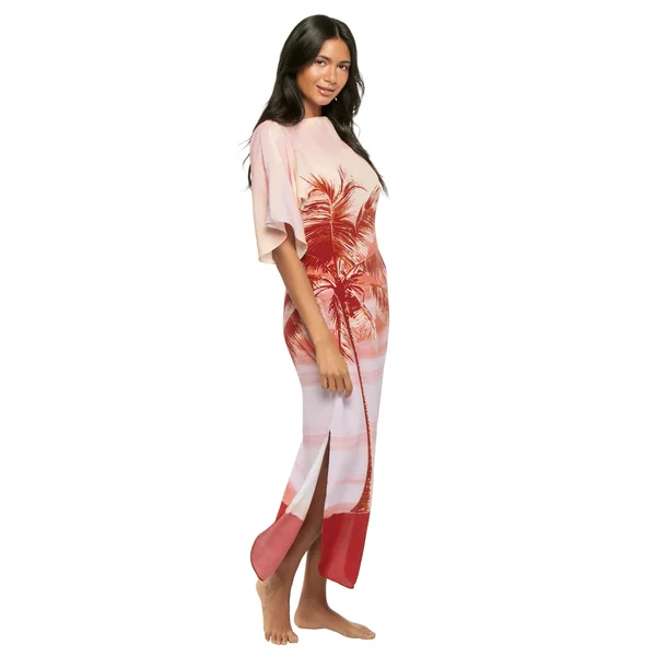 Maxi dress features tropical print, a high neckline, elbow length sleeves and a curved hemline.