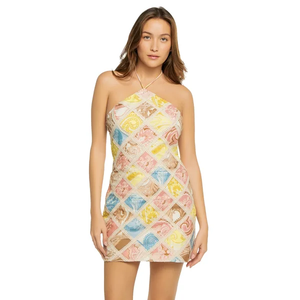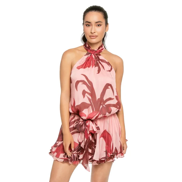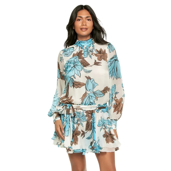 Mini dress features floral print, a high neckline, long puff sleeves with cuffs at the wrists, and a removable waist tie. Offers a tie back closure.