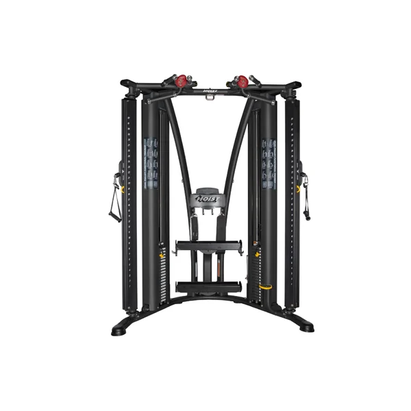 - Space efficient functional trainer featuring convenient corner design and accessory racks