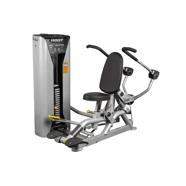 - When the exercise handles are pressed forward the torso support rocks rearward reducing stress on the lower back