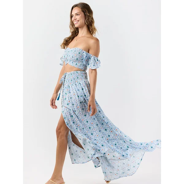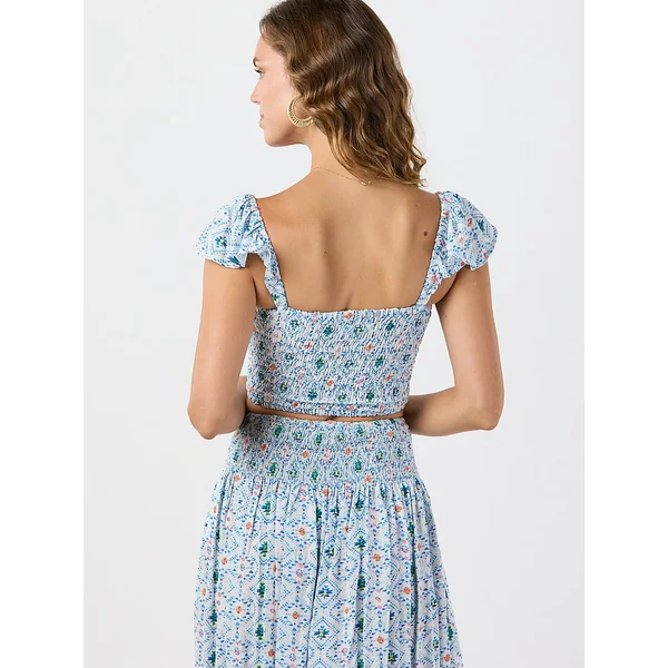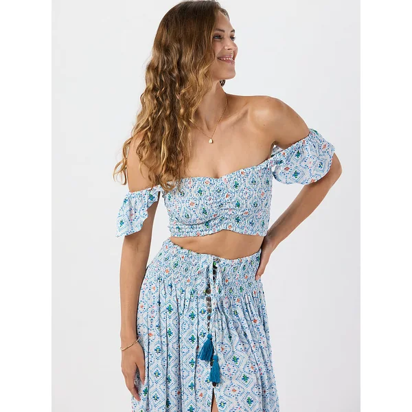 Every wardrobe needs a Crop Top. Try this form-fitting one, with a smocked sweetheart bodice, off-the-shoulder flutter sleeves, and pretty ruching.