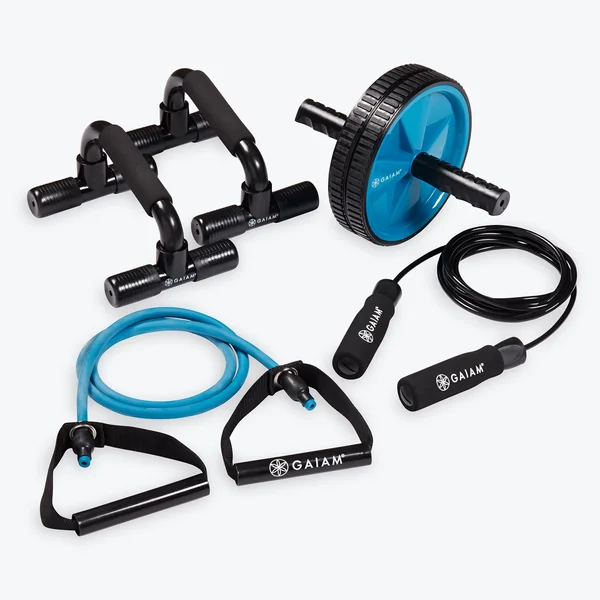 - Includes ab wheel, jump rope, push-up bars, and resistance tube