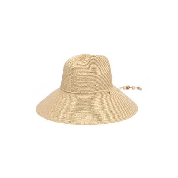 Hat features woven paper straw and a braided band detail with bead accents.