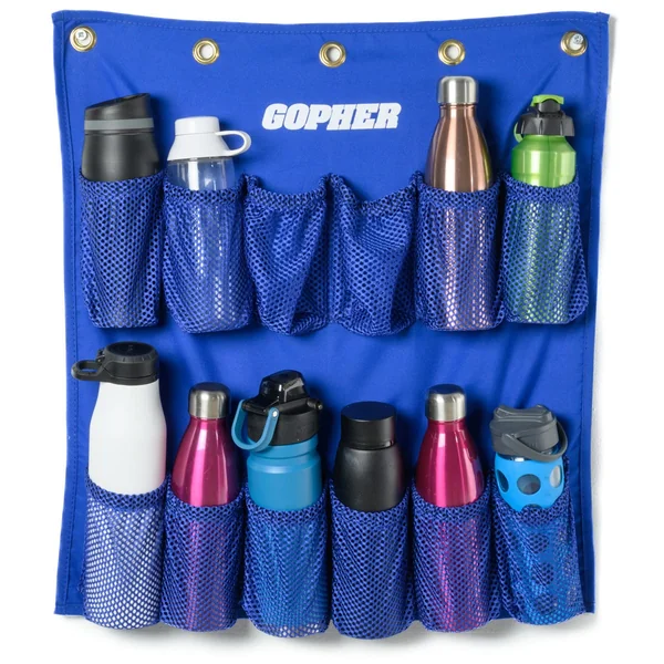 Double-stitched, mesh pockets (3-1/2”W x 6”H) with elastic on the top edge hold bottles up to 3-1/2” dia in place. Water bottle holder has a strong polyester back with 5 grommets to securely support the weight of 12 bottles when the station is fully loaded. Mounting hardware not included. Use indoors or out; store indoors between use. Water bottle storage is available individually or in a pair. 23”W x 23”H; 1/2 lb.