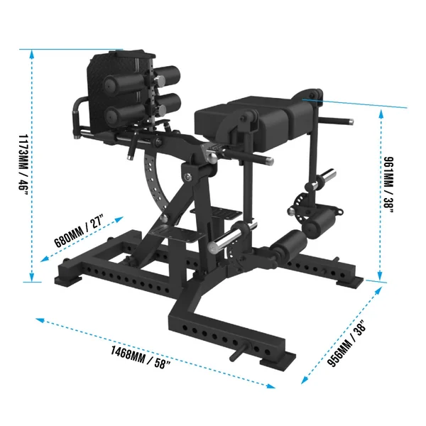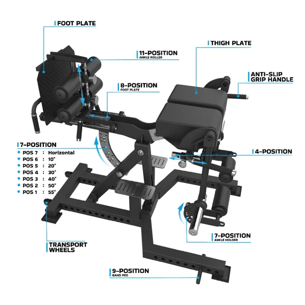 - 7 Angle Adjustments (flat to 55 degree) to switch between GHD, Hip Extensions, Roman Chair, Hyper Extension, and