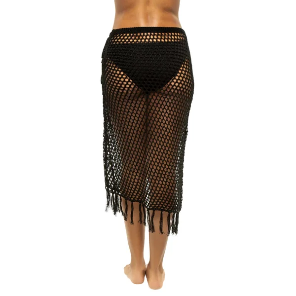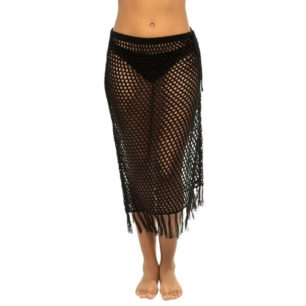 Ibiza sarong features open weave crochet with a fringe hem and side tie.