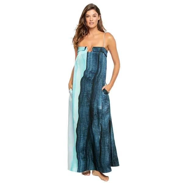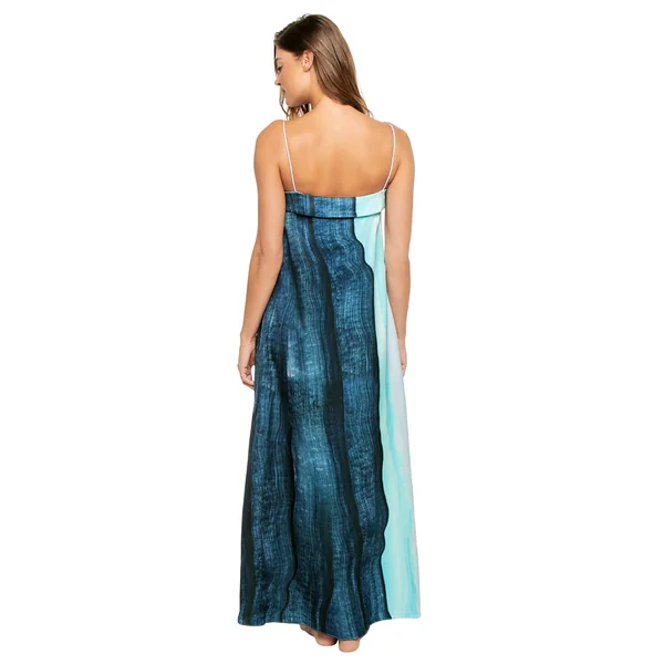 Maxi dress features a fold-over neckline with a notch front detail, spaghetti straps, and side pockets.