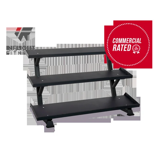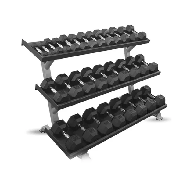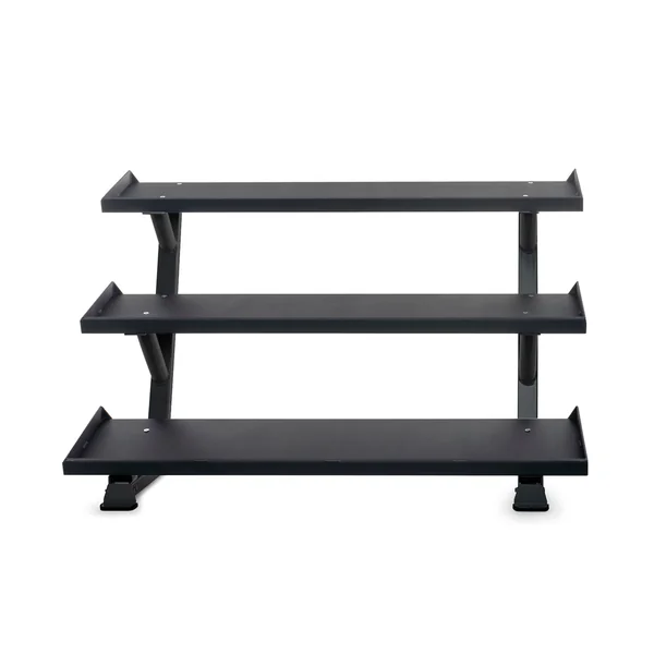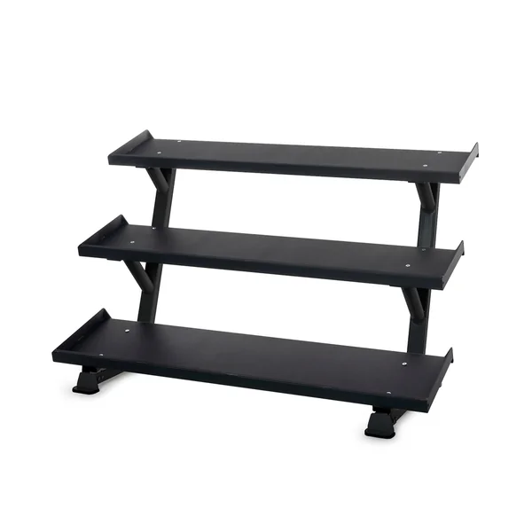 - The three heavy duty tray shelves of this commercial grade rack are properly spaced and angled for the easy removal and storage of a variety of dumbbells or kettle bells.