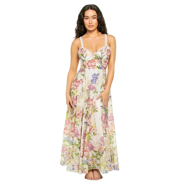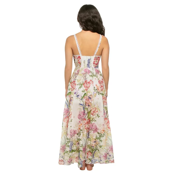 Floral maxi dress features a v-neckline, delicate lace trim along the straps and neckline and a smocked back for a comfortable fit.