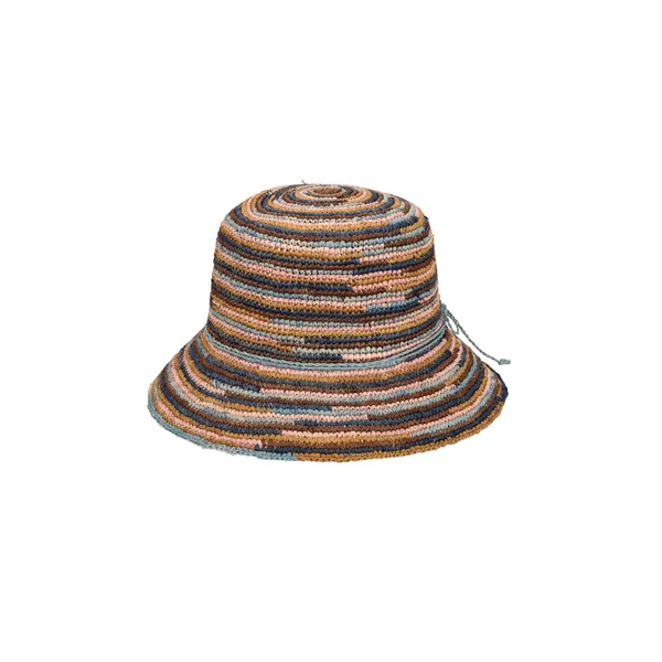 Iris bucket hat features multicolored design, raffia bow detail, and a packable shape for easy travel.