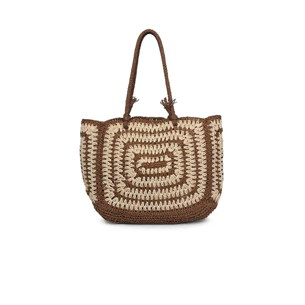Isla tote bag features a handwoven design with intricate patterns. Spacious and sleek, it includes interior pockets to keep you organized.
