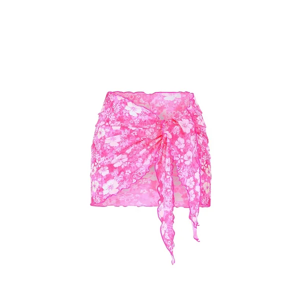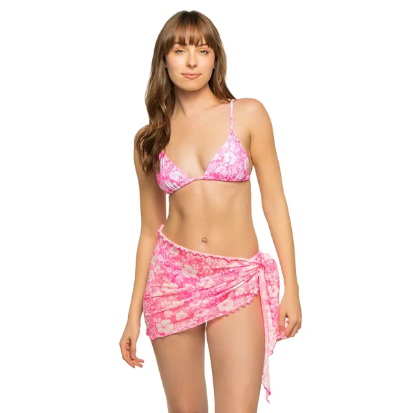 Island blush sarong features floral print, lettuce trim, and a self tie closure.