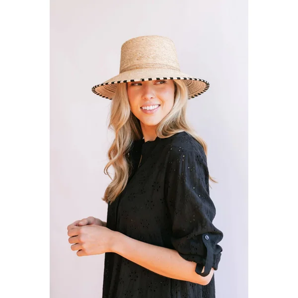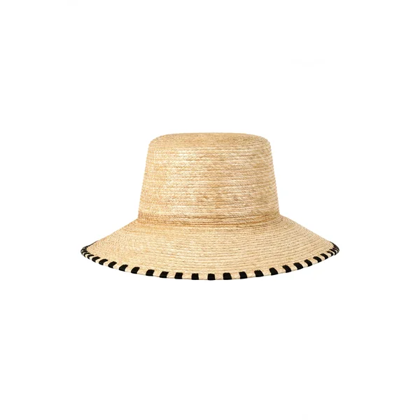 Handwoven bucket hat features black thread pattern sewn into the edge of the brim.