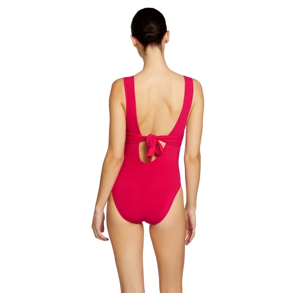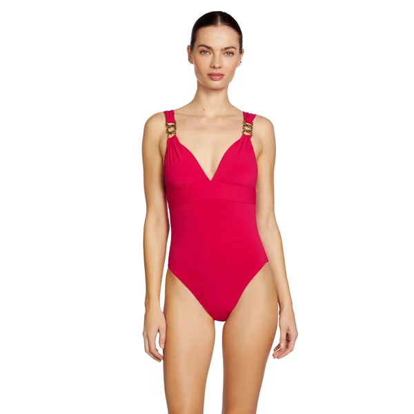Jane one piece swimsuit features v-neckline, chain detail on straps and removable cups. Offers tie back closure and moderate bottom coverage.