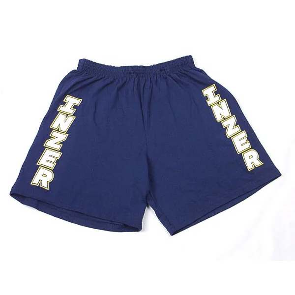 50% polyester/50% cotton jersey knit, elastic waistband, six-inch inseam. Large two-color Inzer logos.
