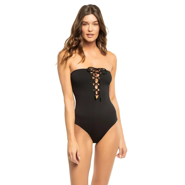 One piece swimsuit features textured fabric, a plunging neckline with lace-up front, side boning, and offers moderate coverage.