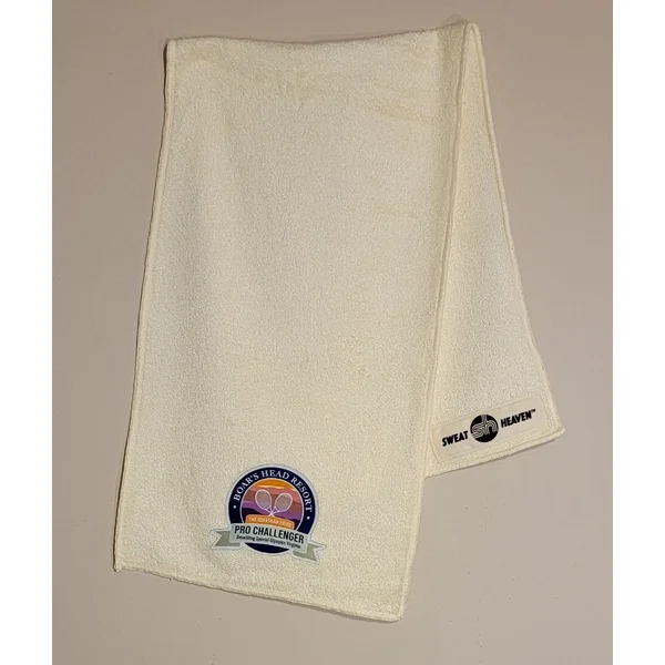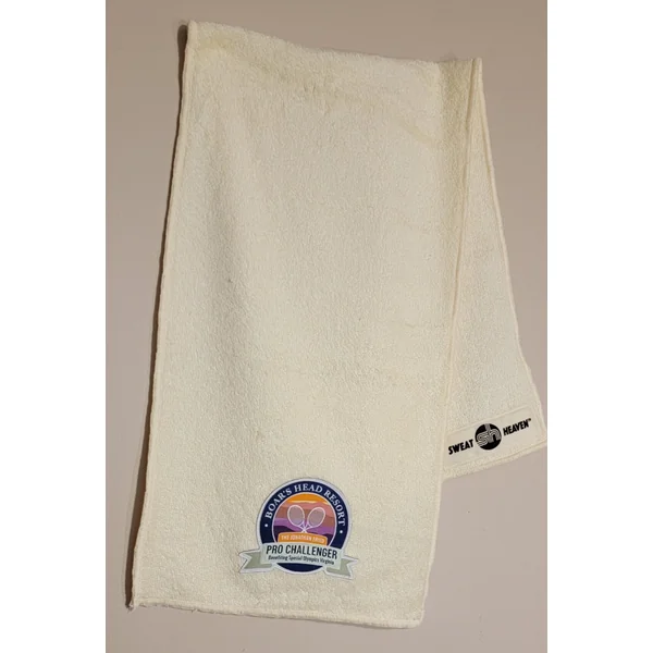 34″ by 10″ neck towel with a woven label sewn onto the neck towel
