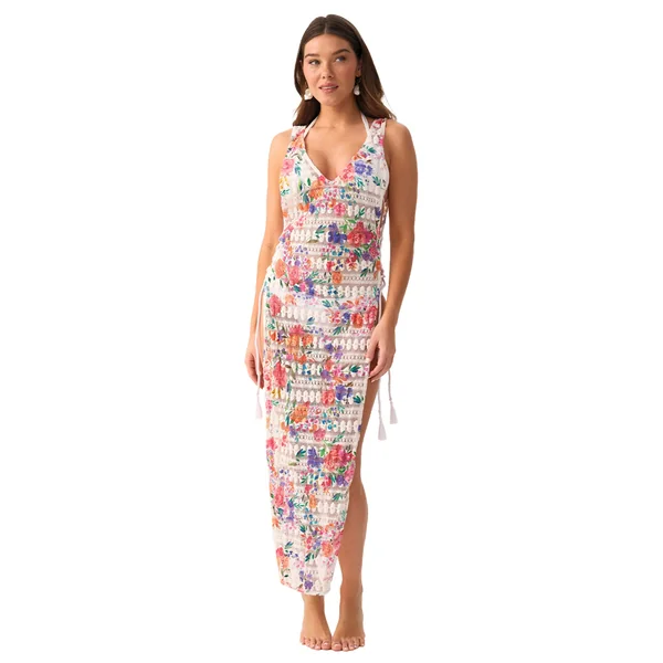 Joy midi dress features semi-sheer lace patterned in colorful flowers, adjustable lace-up side ties with tassel details, and an open back.