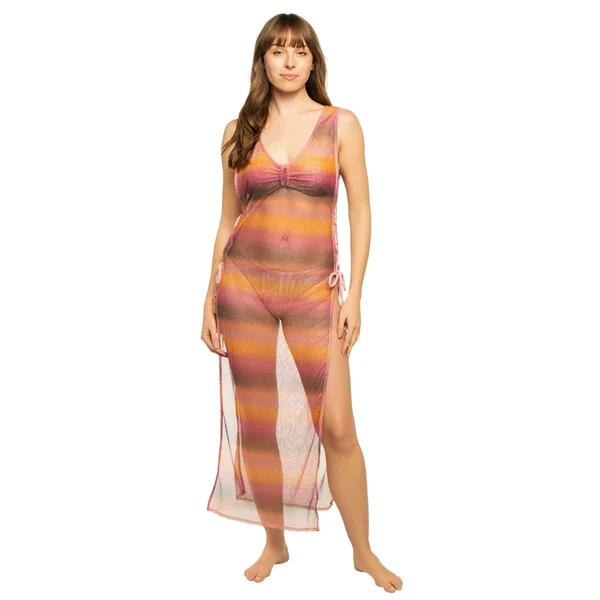 Joy cover up dress features mesh fabric with shimmer, lace-up side ties with tassel details and side slits.