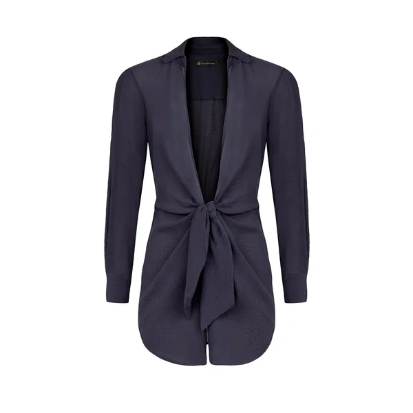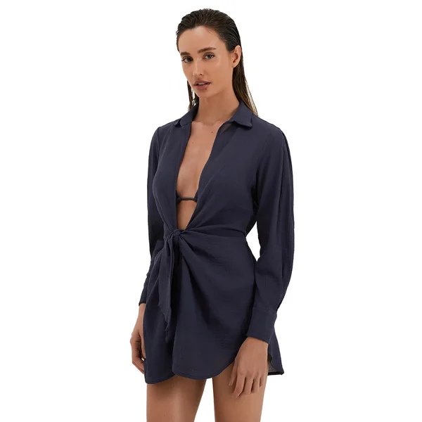 Juliette textured cotton cover up dress features a collared neckline, long sleeves, and a front tie closure.