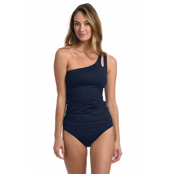 One shoulder tankini top features a shirred bodice for a shaping fit, tummy control, removable cups, and keyhole detail on an adjustable loop strap.