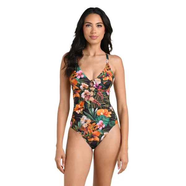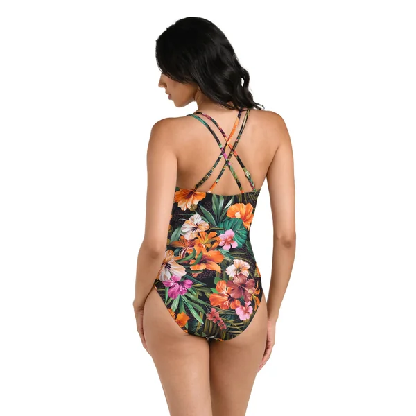 One piece swimsuit features a plunging neckline with two ring details, an adjustable double strap design with a cross back. Offers underwire with removable cups and moderate bottom coverage.