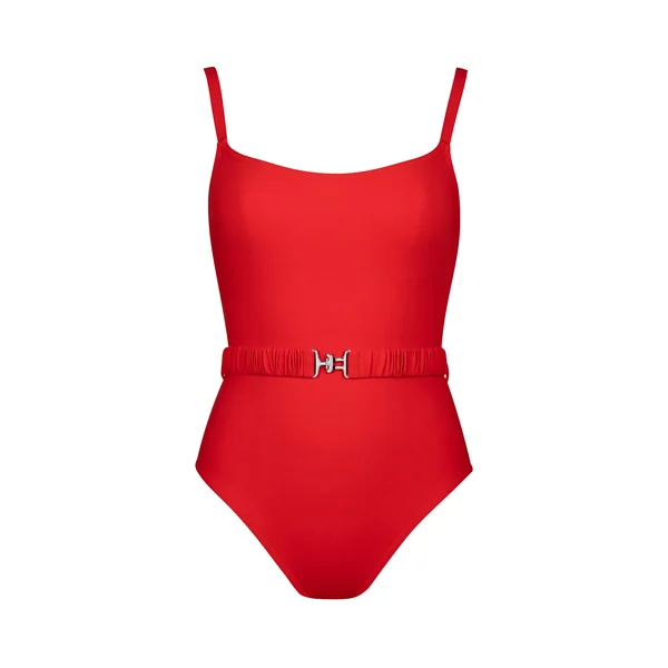 Kia one piece swimsuit features a round neckline, discreet underwire tank, and attached elastic crimp belt. Offers moderate bottom coverage.