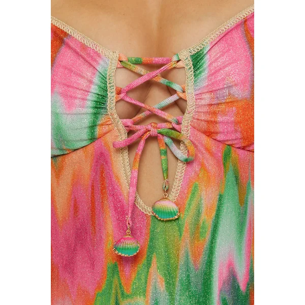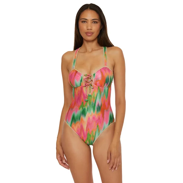 Kylam one piece swimsuit features shimmer fabric, threaded edge stitching, a plunging neckline and a corset style lace-up ties adorned with shells. Offers removable soft cups and adjustable x-back straps.