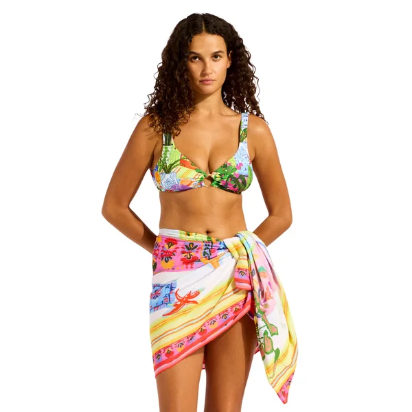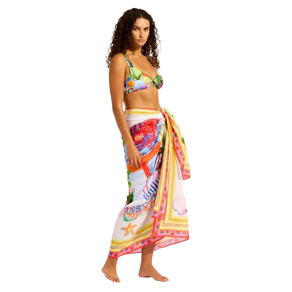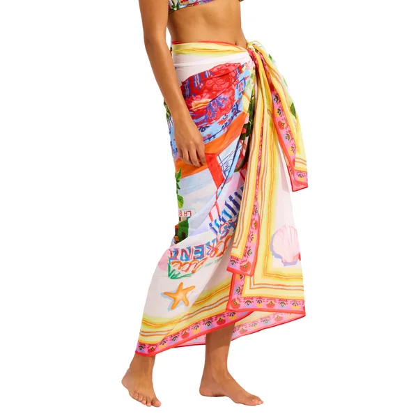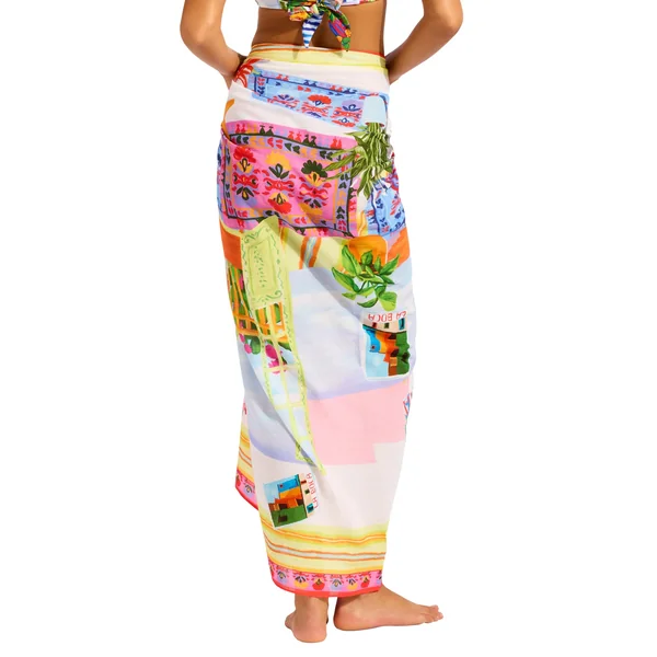 Sarong features a vibrant print and offers self tie closure. Can be worn multiple ways.