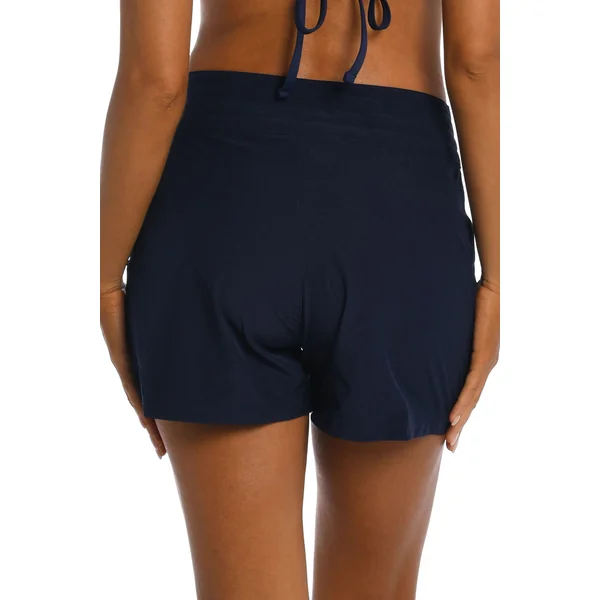 Board shorts with velcro closure and lace-up tie, front pockets, and 3″ inseam.