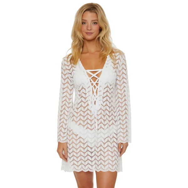 Tunic features open weave with scalloped edge trim and lace-up plunge neckline.