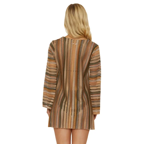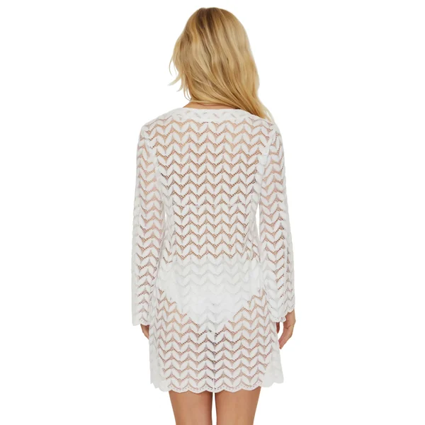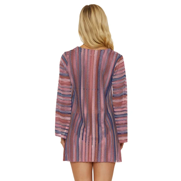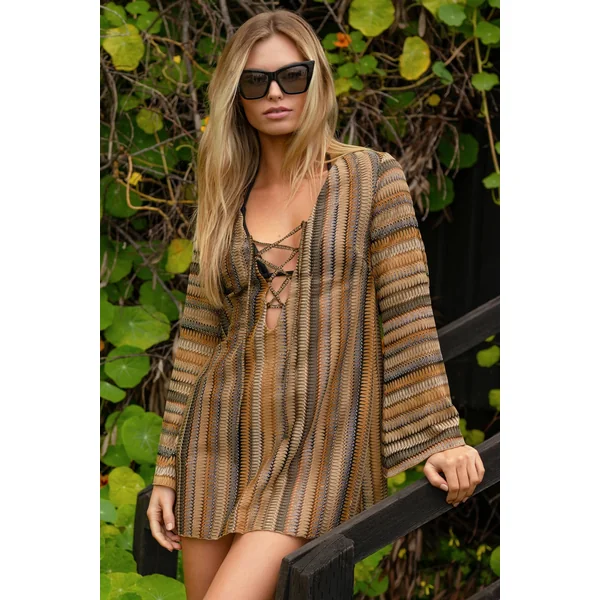 Crochet tunic features shimmer detail. a lace-up plunge neckline and long bell sleeves.