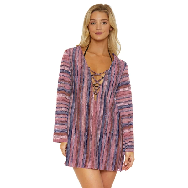 Tunic features crochet knit with a lace-up front neckline and offers long bell sleeves.
