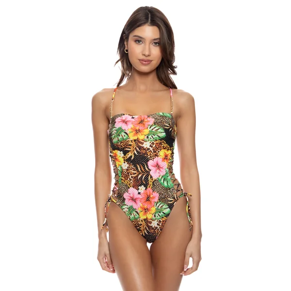 One piece swimsuit features mixed animal and floral print with shimmer, chain link accents on the straps and lace-down sides that enhance the silhouette. Offers soft structured padding, built in underwire and adjustable cross-back straps.